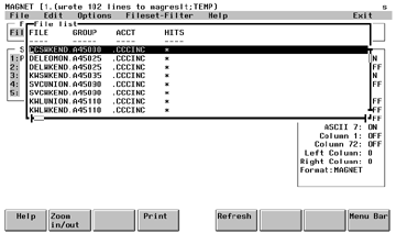 MAGNET scans user defined filesets for the presence of one or more text strings using a flexible pattern matching scheme. It scans normal ASCII flat files and QEDIT work files by default, thus it will not hang on a message file. However, other non-PRIV files can also be specified. A number of different display options are available. This latest version of the System Manager's Toolbox includes a windowed interface version of MAGNET (See Figures 3 and 4 below).