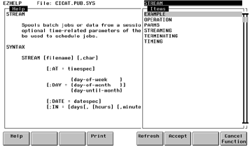EZHELP is a terminal window-based file browser for files formatted according to the MPE HELP catalog format. Even if you do not have any other HELP catalogs on your system EZHELP is a wonderful replacement for MPE HELP. Pop-up, scrollable windows contain lists of topics and items (See Figure 5 below).