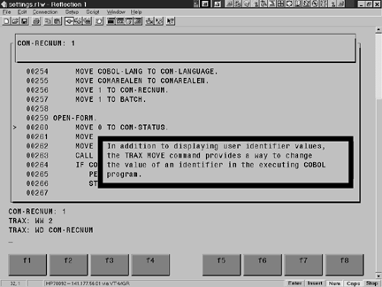 screen for executing commands. Trax does its magic by having you compile your program with $CONTROL SYMDEBUG, and the debugger then keeps the compile listing of the code. Then you build a little cross-reference file that tells Trax where the object code and the code list reside. Somehow Trax synchronizes the source to the object and displays the source to you. This is how you get the source debugging. Im not exactly sure what information that SYMDEBUG puts into the object, but that is obviously the other critical piece. I cant tell how Trax is doing its nice little overlap windows, but they are very fast, and look quite nice. It makes the interface very intuitive. The pop-up online help really eases the process as well. Features Outside of the standard code window, another window you will make a lot of use of is the Watch Window. Take a look at Figure 2 and you will see that we opened a two line watch window with WW 2. We then say that we want to display in the watch window the contents of the variable COM-RECNUM with WD COM-RECNUM. At the top of the screen you will see a small window with the current contents of COM-RECNUM displayed. You are able to easily trace, display, or change the value of any variable at any point in the execution of the program. Figure 3 illustrates a much more esoteric but potentially useful application of Trax: the ability to display the code in assembler and single-step through, one machine instruction at a time. At the top of the screen is a display of the various registers with hex values. If you are low level enough to be able to follow this kind of stuff, its there for you to enjoy. Trax will let you do pretty much anything that you want with source code in terms of break points, tracing, single-stepping, jumping around code, and modifying the value of variables. Installation and Documentation Installation is a very straightforward RESTORE and STREAM combination, pretty typical for most HP 3000 software products today. The documentation is well